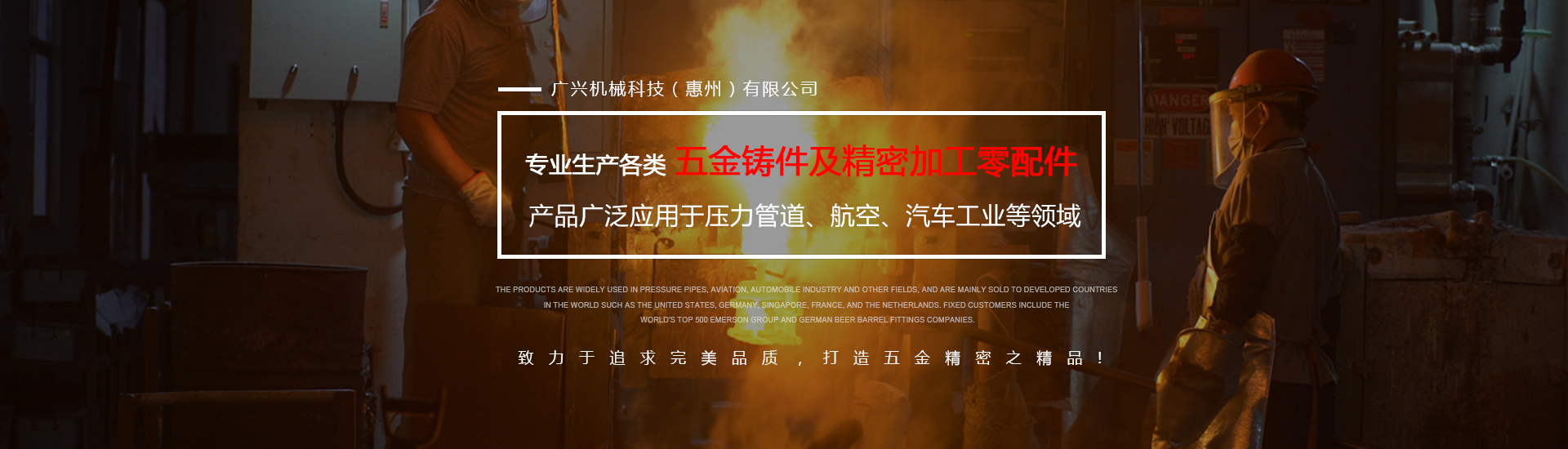 公司專業生產各類五金鑄件及精密加工零配件,可熔煉材質為全系列不銹鋼及碳鋼,主要生產材質有304316、316L、17-4430、409等,年生產各種不銹鋼鑄件1000余噸。產品廣泛應用于壓力管道、航空、汽車工業等領域,主要銷往美國、德國、新加坡、法國、荷蘭等世界發達國家,固定客戶有世界500強艾默生集團及德國啤酒桶配件公司。